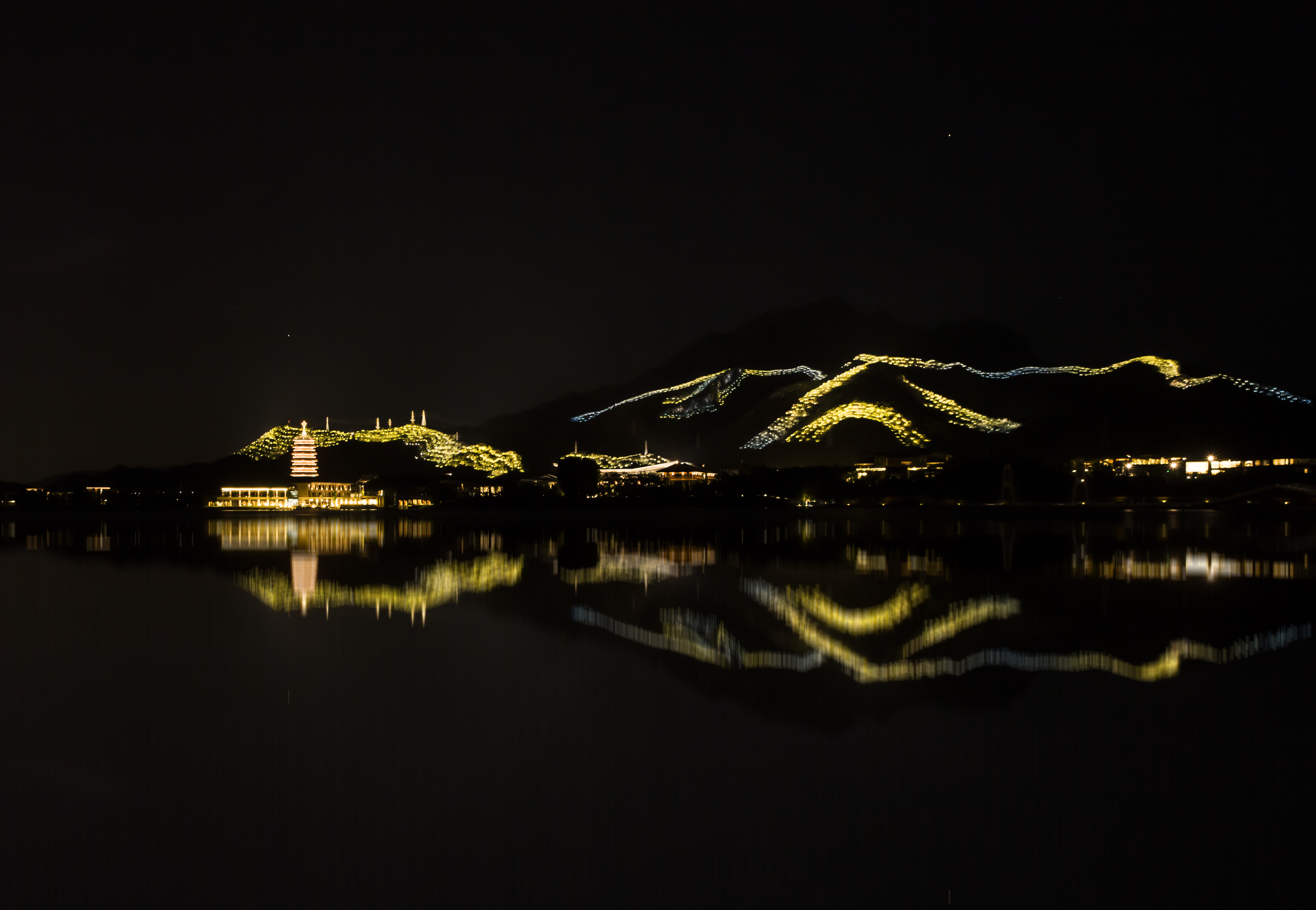 雁棲湖位于北京懷柔城北8公里處的燕山腳下,風光旖旎,湖水清澈,其夜景景觀覆蓋了21平方公里的山體和沿線公路。最初,雁棲湖夜景打造是為迎接“一帶一路”會議的到來,并成功在會議期間吸引了世人的矚目,在會議結束后,雁棲湖也成為了人們夜游的圣地。