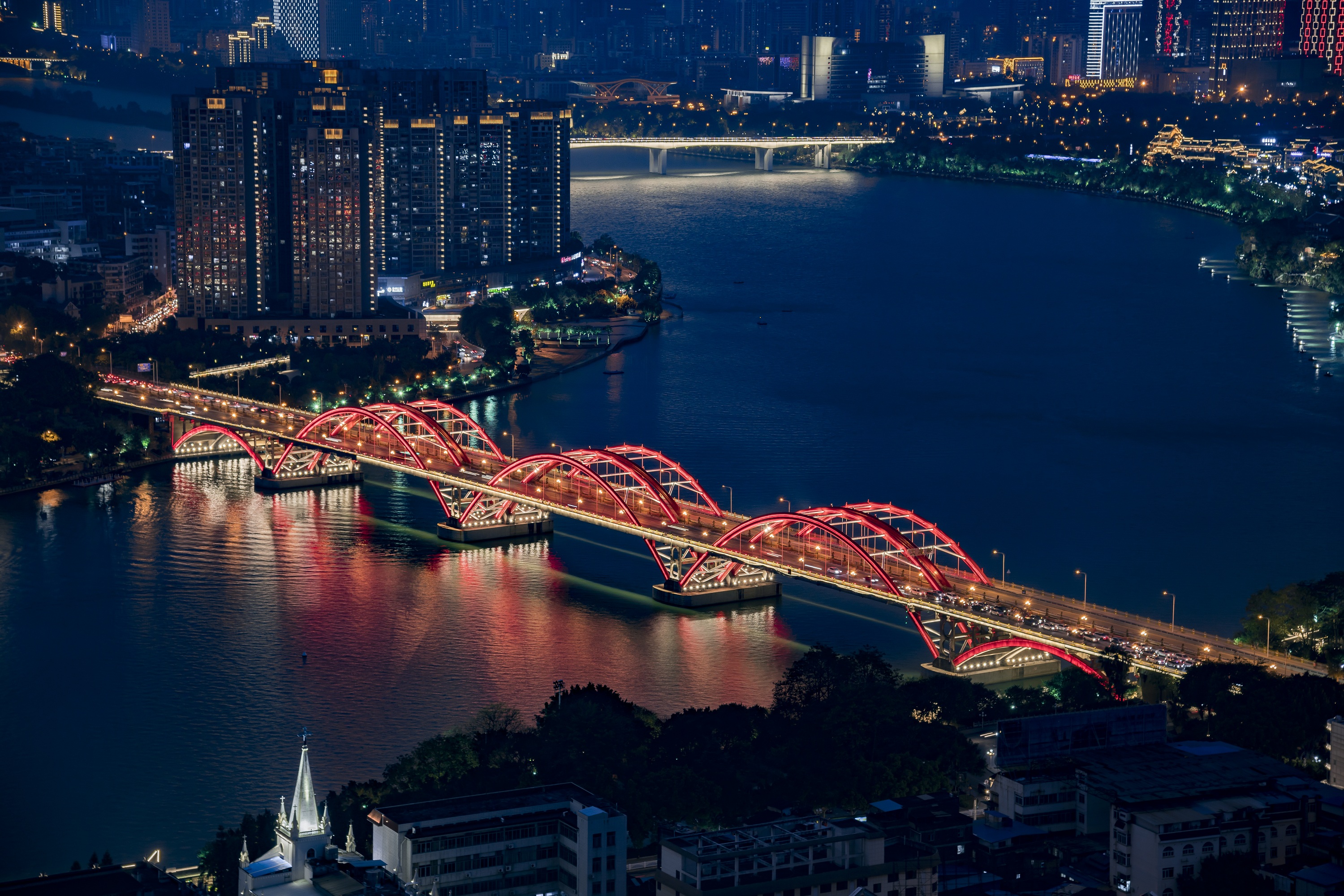 柳州作為廣西最大的工業(yè)城市的同時又是風景秀麗的歷史文化名城,因柳江在其境內得名。朗明智誠為其境內的柳江河兩岸的7座山體、9座橋梁、332棟樓梯建筑、21.4公里景觀帶進行夜景燈光運維服務。柳州的亮化,是將科技與文化融合,使柳州更具風采。